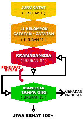Perhatikan juga bahwa dari ukuran ketiga (kramadangsa) hendak menuju ke ukuran keempat (manusia tanpa ciri), terdapat simpang tiga. Untuk menuju ke ukuran keempat terdapat penghalang yang berupa PENDAPAT BENAR, yaitu rasa benar sendiri.